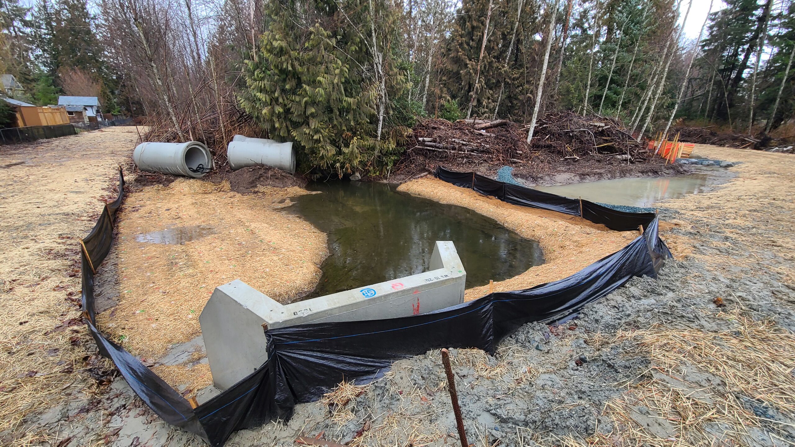 The storm water control infrastructure includes storm sewers ranging in size from 300mm to 1050mm, manholes ranging in diameter from 1350mm to 1500mm, a weir plate flow control device, engineered forebay, rip rap lined swales and overflow scuppers, Newbury weirs, berms, granular access road, pedestrian trail and chain-link fencing, constructed under environmental monitoring.